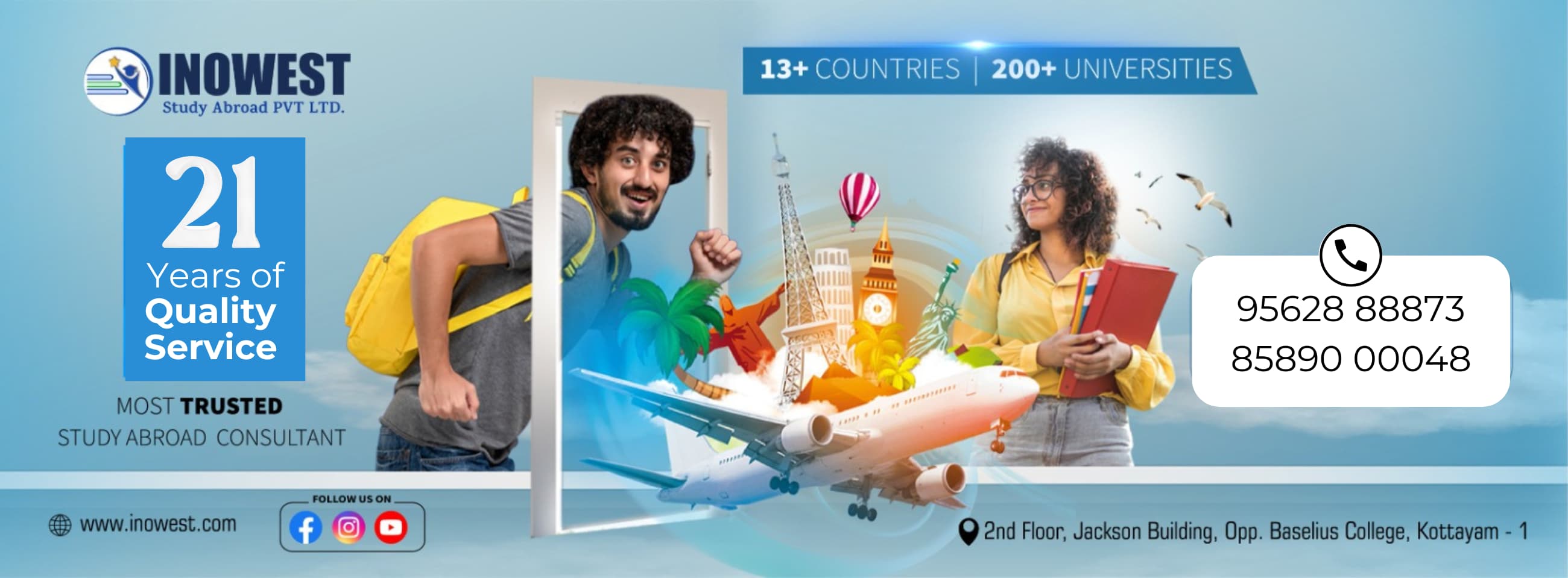 INOWEST Study Abroad is a well-respected consultancy located in Kottayam, Kerala, India, boasting two decades of experience in helping students chase their educational aspirations overseas. Our passionate team of experts is dedicated to offering a full range of services, making sure students are thoroughly prepared for their international education adventures. Thanks to our commitment to excellence and personalized support, we've built a solid reputation among both our students and partners.
