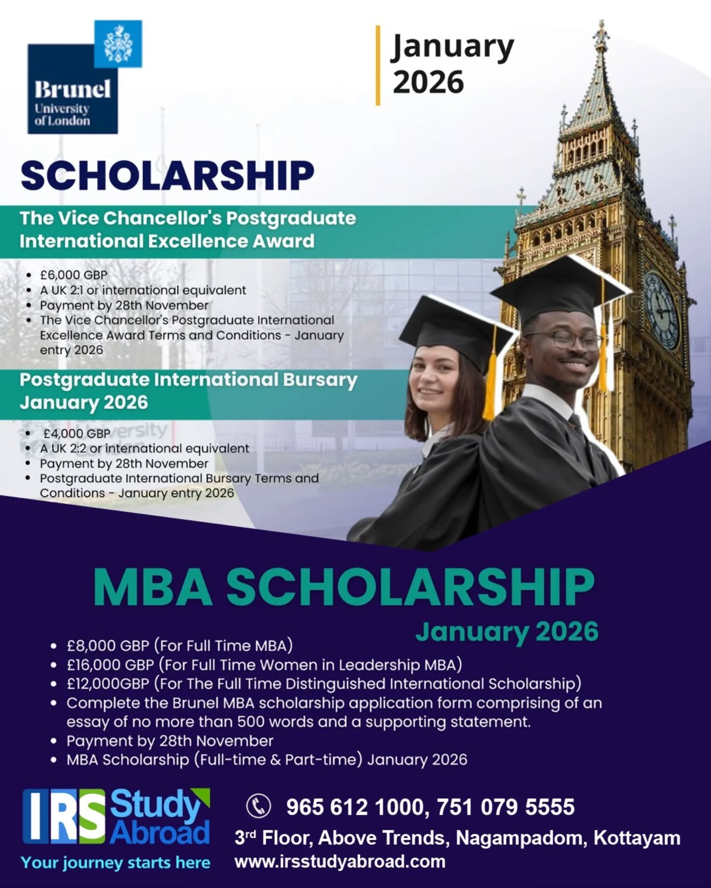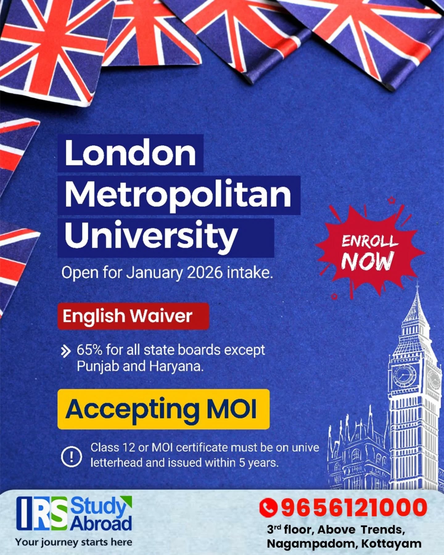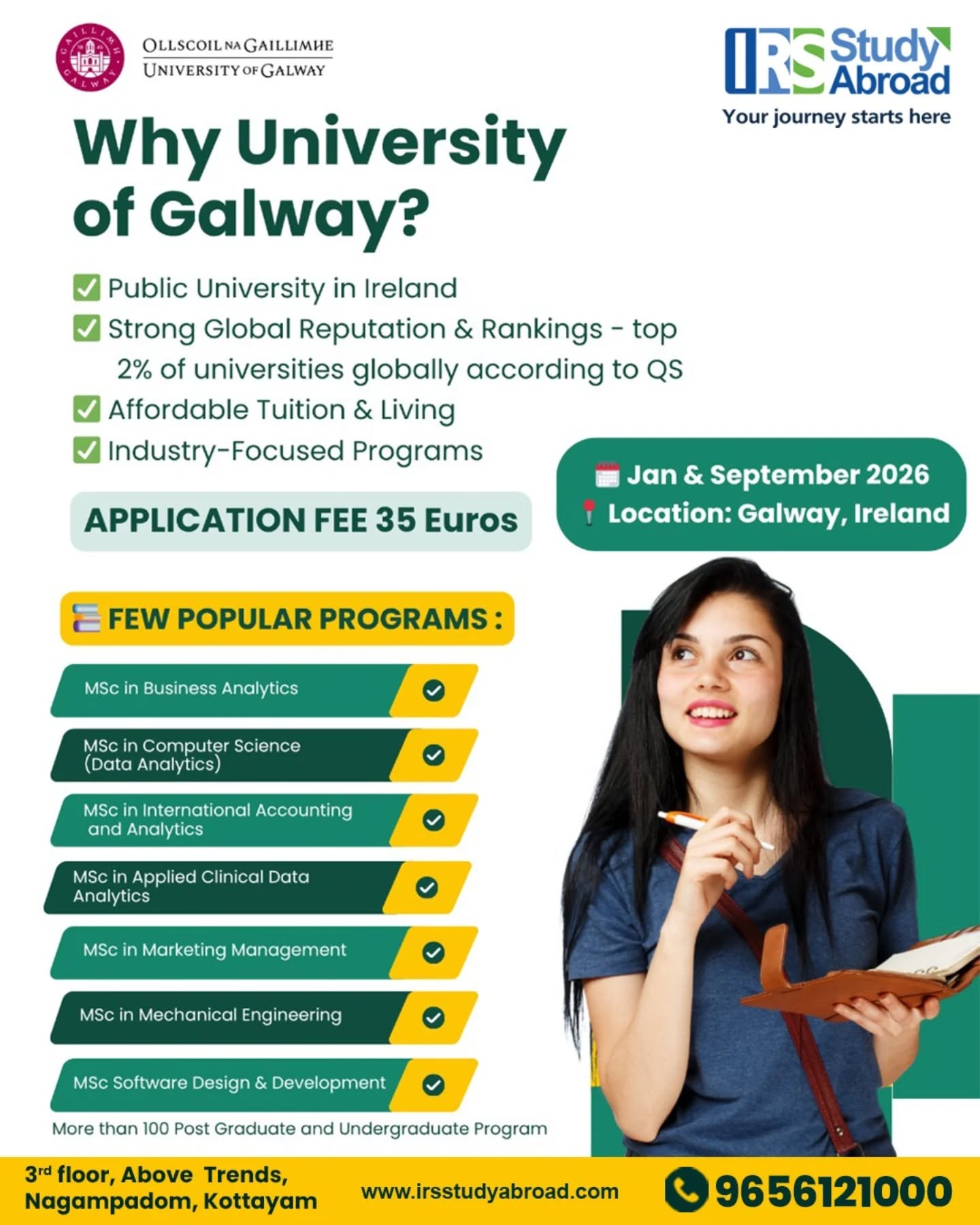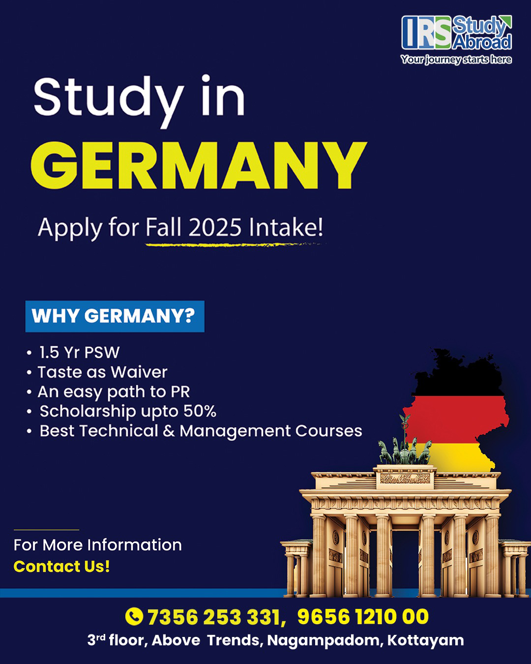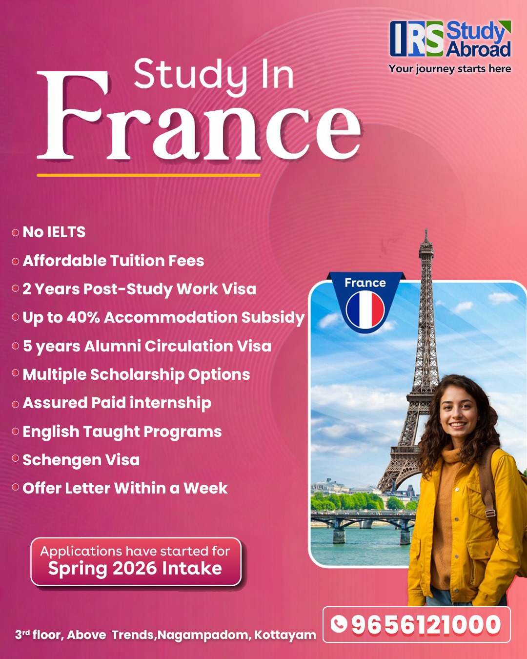 IRS Study Abroad is a well-respected Overseas Education Consultancy based in Kottayam, dedicated to helping students navigate their study abroad journey. We offer a comprehensive range of services, from personalized student counseling and selecting the right country and course, to university selection and assistance with collateral-free overseas education loans. Our support extends to crafting strong Statements of Purpose (SoPs), preparing for interviews, language exams, and visa applications. With our expert guidance, students receive customized solutions that include admissions to top 500 universities, vocational training in Germany, or affordable, job-oriented courses in Europe’s up-and-coming study destinations like Albania, Montenegro, and Moldova, as well as popular Asian locations such as Dubai and Malaysia. Get ready for the 2026 intake with amazing cashback offers and guaranteed success in your educational journey.