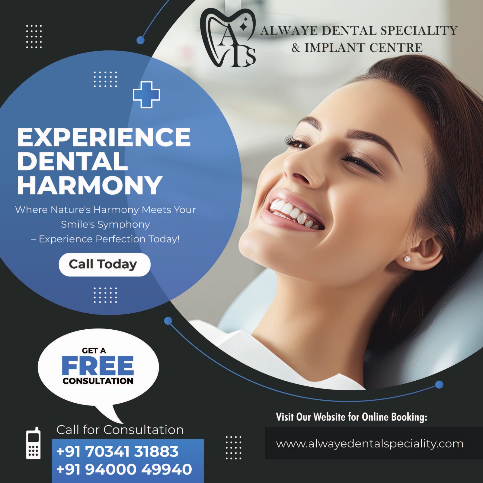 Alwaye Dental Speciality & Implant Centre is a modern, patient-focused dental clinic offering comprehensive care for individuals and families. With branches in Aluva and Kathrikadavu, Kaloor (Kochi), the clinic combines general and specialized dental services under one roof, aiming to provide high-quality, affordable care in a welcoming and hygienic environment. Their team adopts a multidisciplinary approach, offering treatments in restorative dentistry, cosmetic enhancements, dental implants, pediatric care, orthodontics, root canal therapy, gum treatments, oral surgery, and advanced diagnostic services. A key part of their philosophy is biomimetic dentistry, which focuses on preserving the natural structure and function of teeth. The clinic also emphasizes Guided Biofilm Therapy (GBT) — a gentle, modern technique for dental cleaning and plaque control. Designed to be family- and child-friendly, the clinic takes pride in open communication with patients, explaining all treatment options, associated risks, and costs clearly. They integrate laser-assisted procedures and minimally invasive techniques to ensure comfortable, pain-free treatment experiences. Whether it's routine dental maintenance or complex full-mouth rehabilitation, Alwaye Dental Speciality & Implant Centre is committed to delivering trusted dental solutions with professionalism and compassion.