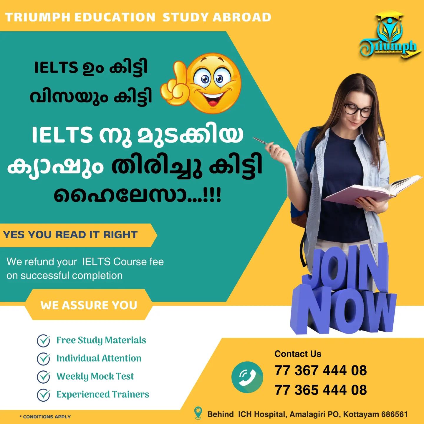 Triumph Education Center stands out as a leading educational hub in Kottayam, Kerala. This center is dedicated to providing thorough training for a range of English proficiency exams, such as IELTS, PTE, and TOEFL. They offer both in-person and online classes to meet the varied needs of their students. With a focus on personalized learning, they maintain small class sizes and sessions led by experienced instructors. On top of that, Triumph Education Center also provides comprehensive study abroad consulting services, helping students with everything from crafting their Statement of Purpose (SOP) to navigating the application and visa processes. Their unwavering commitment to quality education and student achievement has made them a go-to choice for those looking to study overseas.