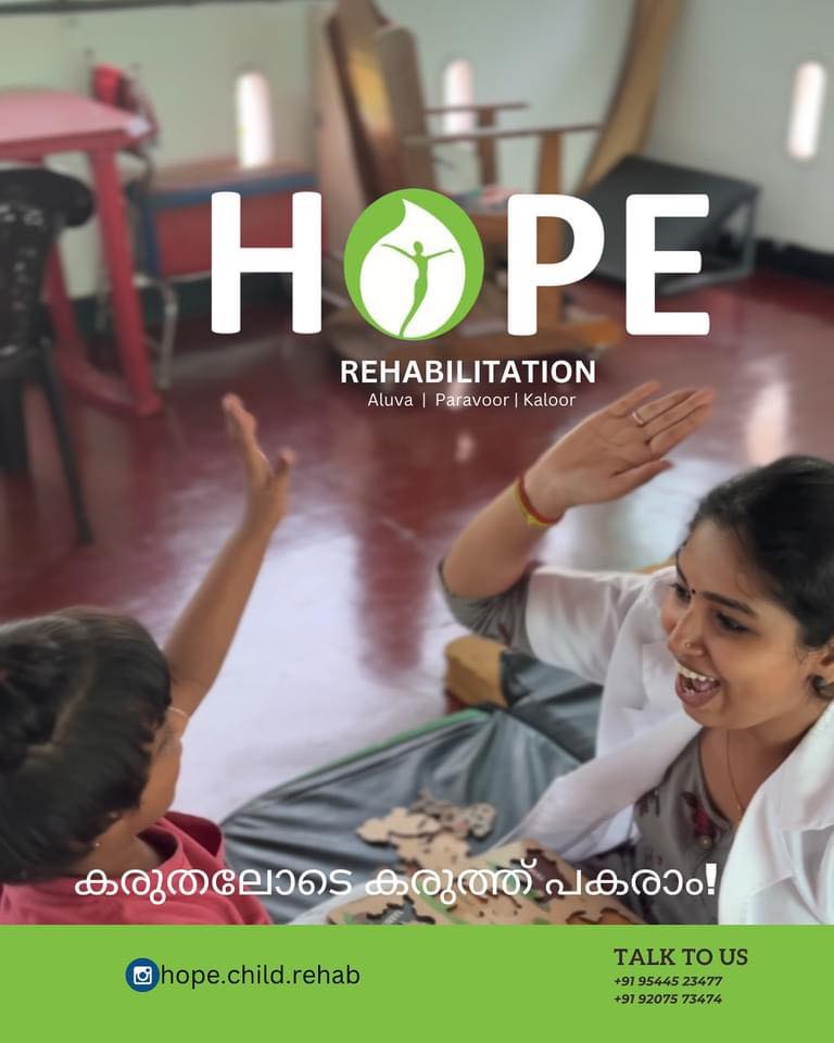 Hope Rehabilitation Centre in Palarivattom, Ernakulam offers expert therapy services for children and adults. We specialize in speech therapy, behavioral therapy, occupational therapy, and physiotherapy, tailored to support individual growth and development. Our team of certified therapists provides personalized care in a child-friendly and supportive environment. Whether it's developmental delays, communication challenges, or physical rehabilitation, Hope is here to help individuals achieve their full potential. Trusted by families across Kochi, we are committed to quality therapy services with compassion, professionalism, and results.