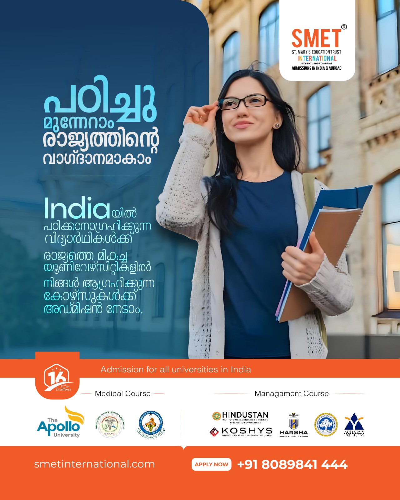 St. Mary's Education Trust, or SMET India, has been a prominent education consultancy in Kerala since its inception in 2012. We take pride in helping students gain admission to some of the top universities both in India and abroad, guiding over 27,000 individuals toward brighter career paths. At SMET India, our mission is to provide expert advice and unwavering support for higher education, ensuring that students secure spots in the best institutions, whether in India or around the globe. Our consultancy services encompass a diverse array of degree programs, including BSc in Nursing, engineering, management, and much more. We assist students in navigating the often complex admission processes, from the initial application all the way to visa assistance, making their transition to their chosen educational institutions as seamless as possible. With a commitment to excellence, SMET India also has a sister organization, SMET International, which broadens our global outreach. Whether you're searching for the finest colleges nearby or prestigious universities in your area, SMET India is your reliable partner in achieving educational success. Join us to uncover exceptional opportunities in higher education and turn your academic aspirations into reality.