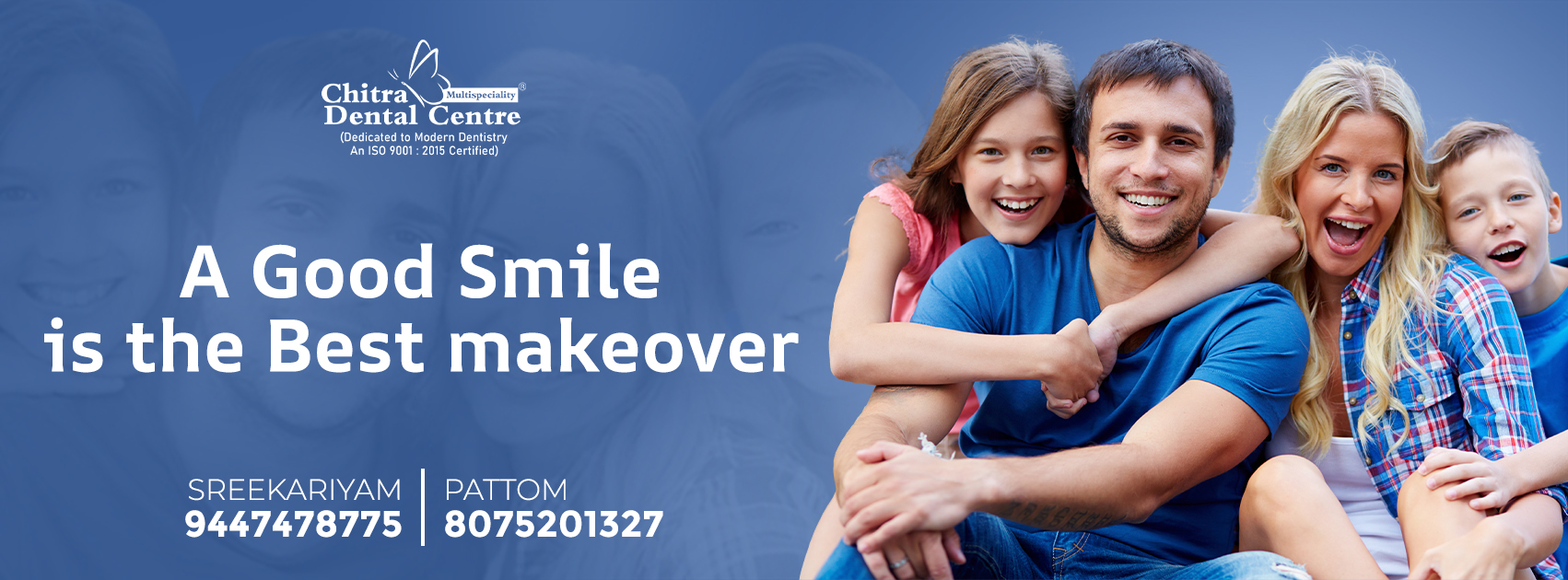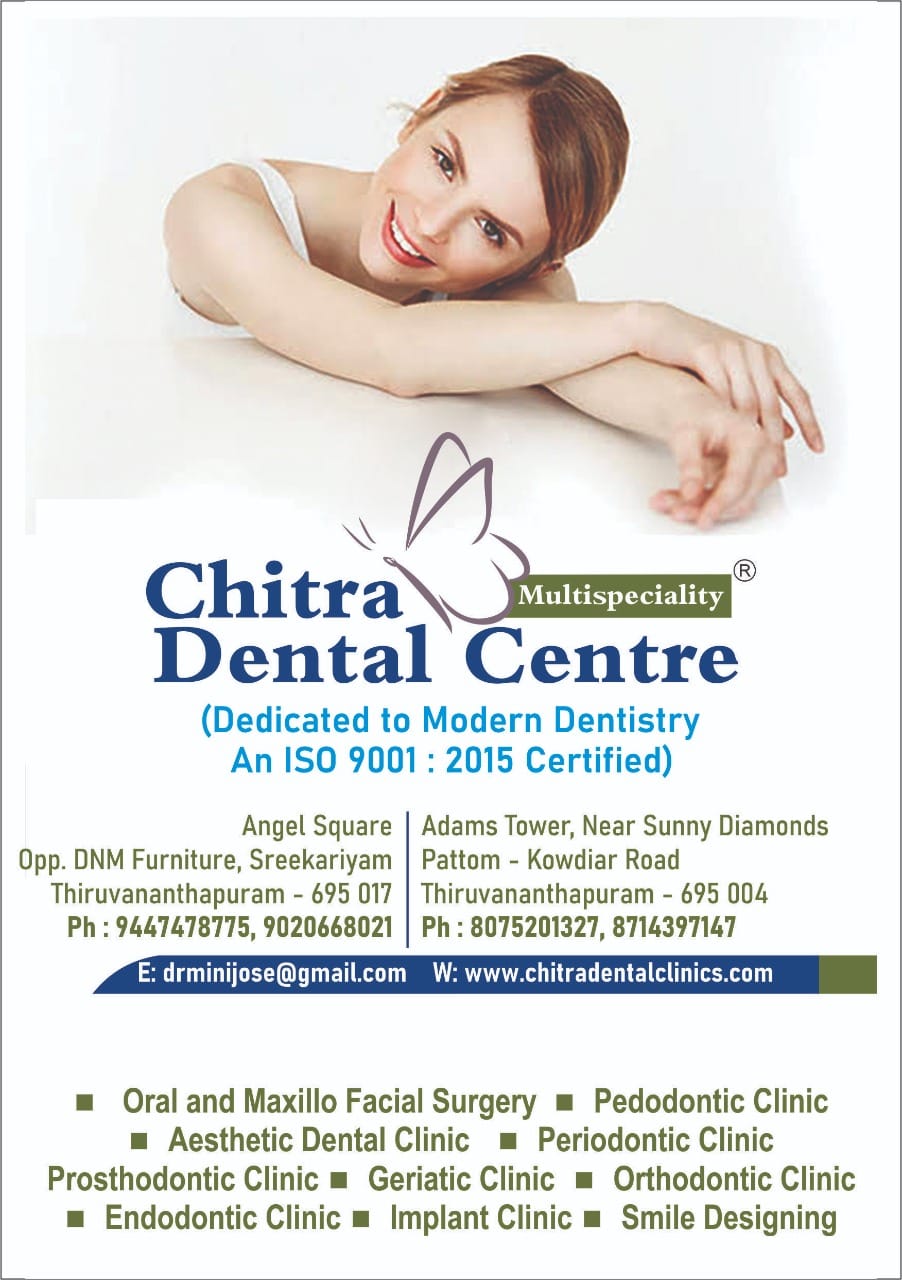 Chitra Multispeciality Dental Centre, an ISO 9001-2015 certified multispecialty clinic, started its eventful journey in the suburb of Sreekariyam in Thiruvananthapuram in the year 1993. Our group of specialist dentists and well-trained support staff has grown over the years to encompass seven specialty departments. Housed in an easily accessible three-storied centre off National Highway 66, Chitra is a trusted name in dental care among a vast number of people from Kerala and outside. What customers find in Chitra is a total solution provider for the family when it comes to dental health, identifying and addressing needs of individuals, right from infancy to the sunset years of their lives.