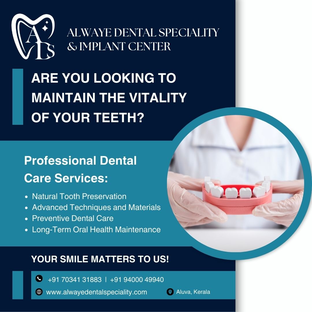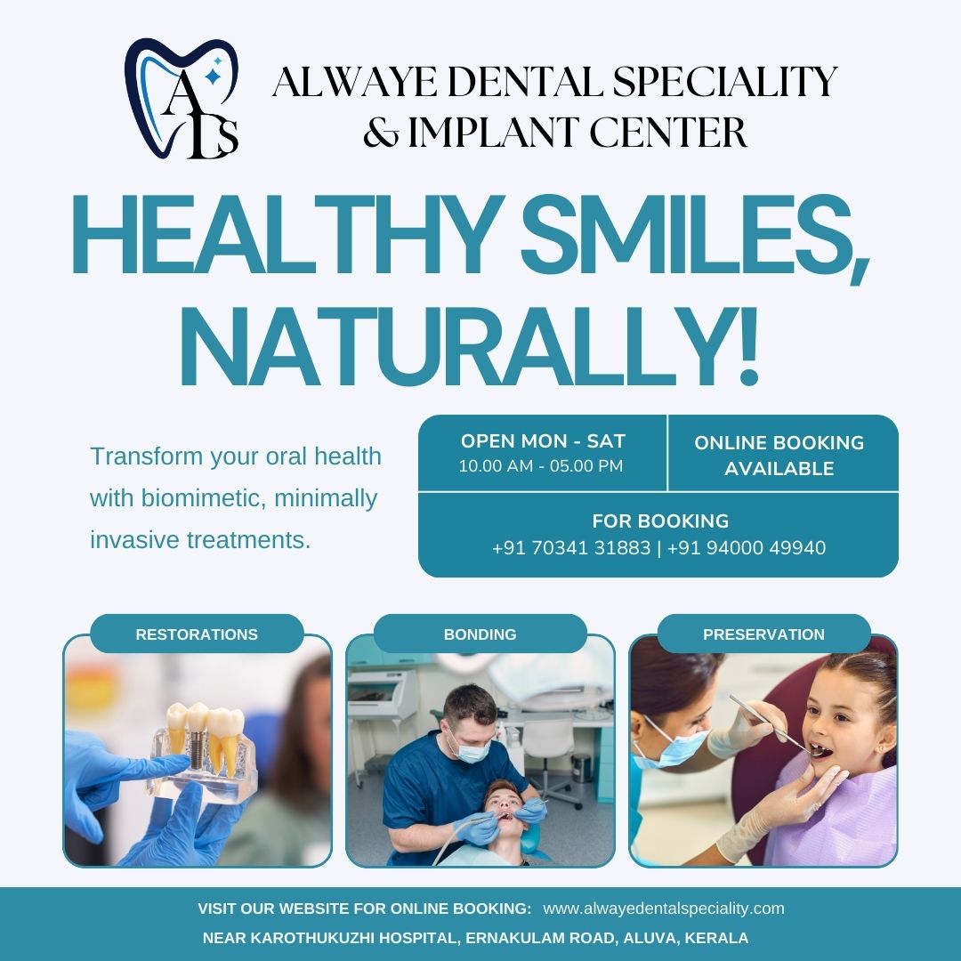 Alwaye Dental Speciality & Implant Centre is a modern, patient-focused dental clinic offering comprehensive care for individuals and families. With branches in Aluva and Kathrikadavu, Kaloor (Kochi), the clinic combines general and specialized dental services under one roof, aiming to provide high-quality, affordable care in a welcoming and hygienic environment. Their team adopts a multidisciplinary approach, offering treatments in restorative dentistry, cosmetic enhancements, dental implants, pediatric care, orthodontics, root canal therapy, gum treatments, oral surgery, and advanced diagnostic services. A key part of their philosophy is biomimetic dentistry, which focuses on preserving the natural structure and function of teeth. The clinic also emphasizes Guided Biofilm Therapy (GBT) — a gentle, modern technique for dental cleaning and plaque control. Designed to be family- and child-friendly, the clinic takes pride in open communication with patients, explaining all treatment options, associated risks, and costs clearly. They integrate laser-assisted procedures and minimally invasive techniques to ensure comfortable, pain-free treatment experiences. Whether it's routine dental maintenance or complex full-mouth rehabilitation, Alwaye Dental Speciality & Implant Centre is committed to delivering trusted dental solutions with professionalism and compassion.