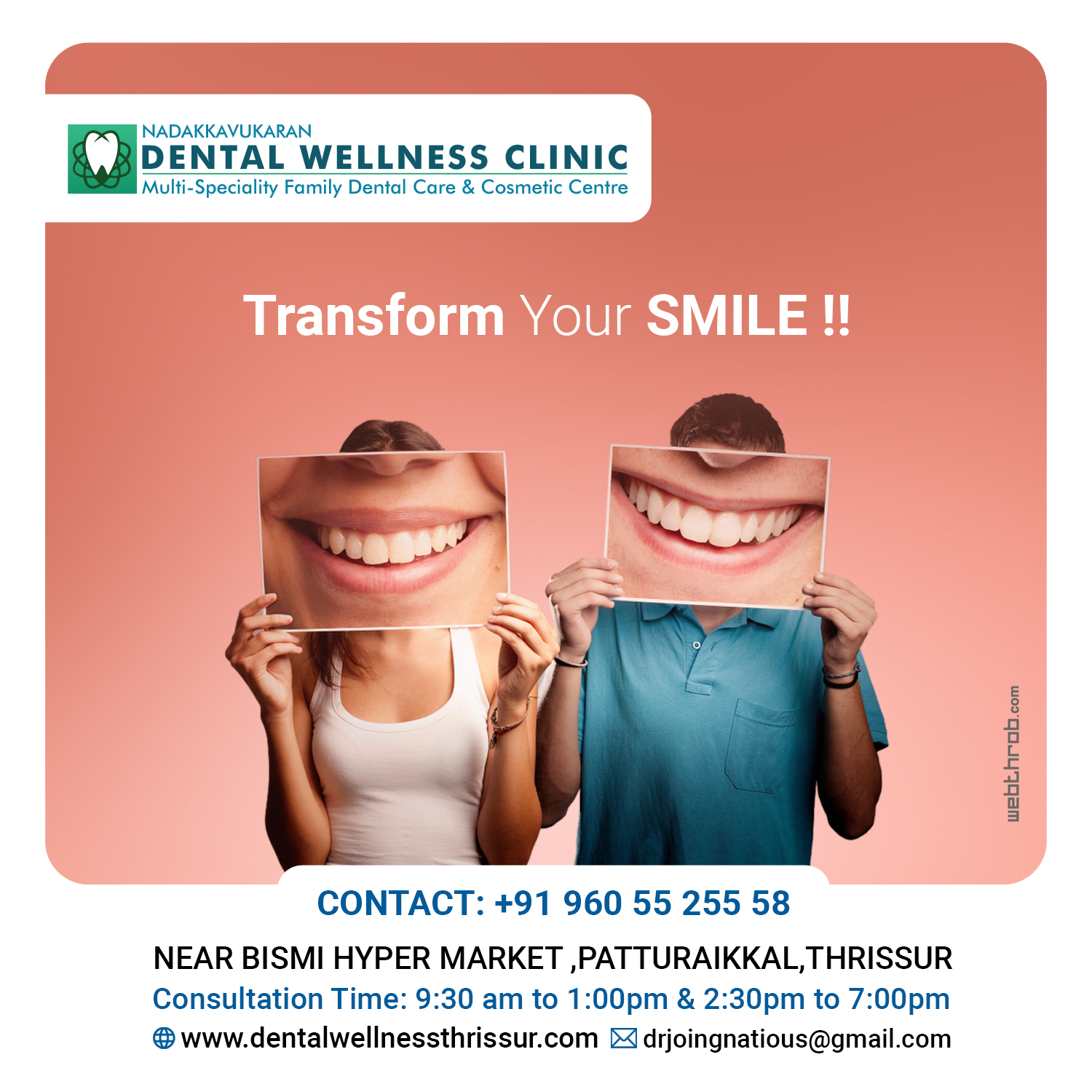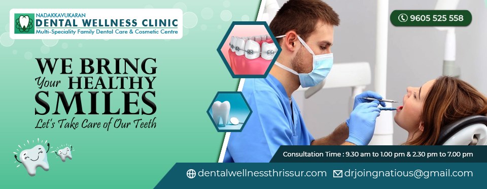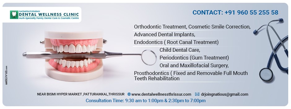 Nadakkavukaran Dental Wellness Clinic Patturaikkal is situated in the heart of the Thrissur City has been at the forefront of Dental Healthcare, committed to provide world-class dental treatment at affordable rates. The clinic aims at offering different specialties of dentistry like Orthodontics, Implantology, Tooth Jwellery, Oral and maxillofacial Surgery, Gum Care/Periodontics, Complete Child Care, Root Canal Treatment, Laser Dentistry, Cosmetic Dentistry and Prosthodontics Dentistry all under one roof.