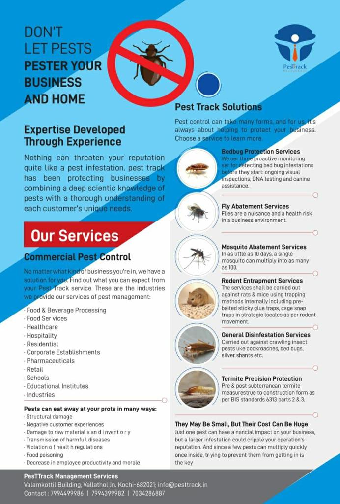Looking for the best, most affordable, and reliable pest control service in Kochi and across Kerala? At PesTTrack, we provide top-notch pest management solutions for homes and commercial properties. Our expert technicians specialize in eliminating termites, bed bugs, cockroaches, rats, mosquitoes, and more. Using advanced techniques and high-quality equipment, we ensure a pest-free environment with long-lasting results. Whether you're in Kochi, its suburbs, or anywhere in Kerala, trust PesTTrack for effective and hassle-free pest control services