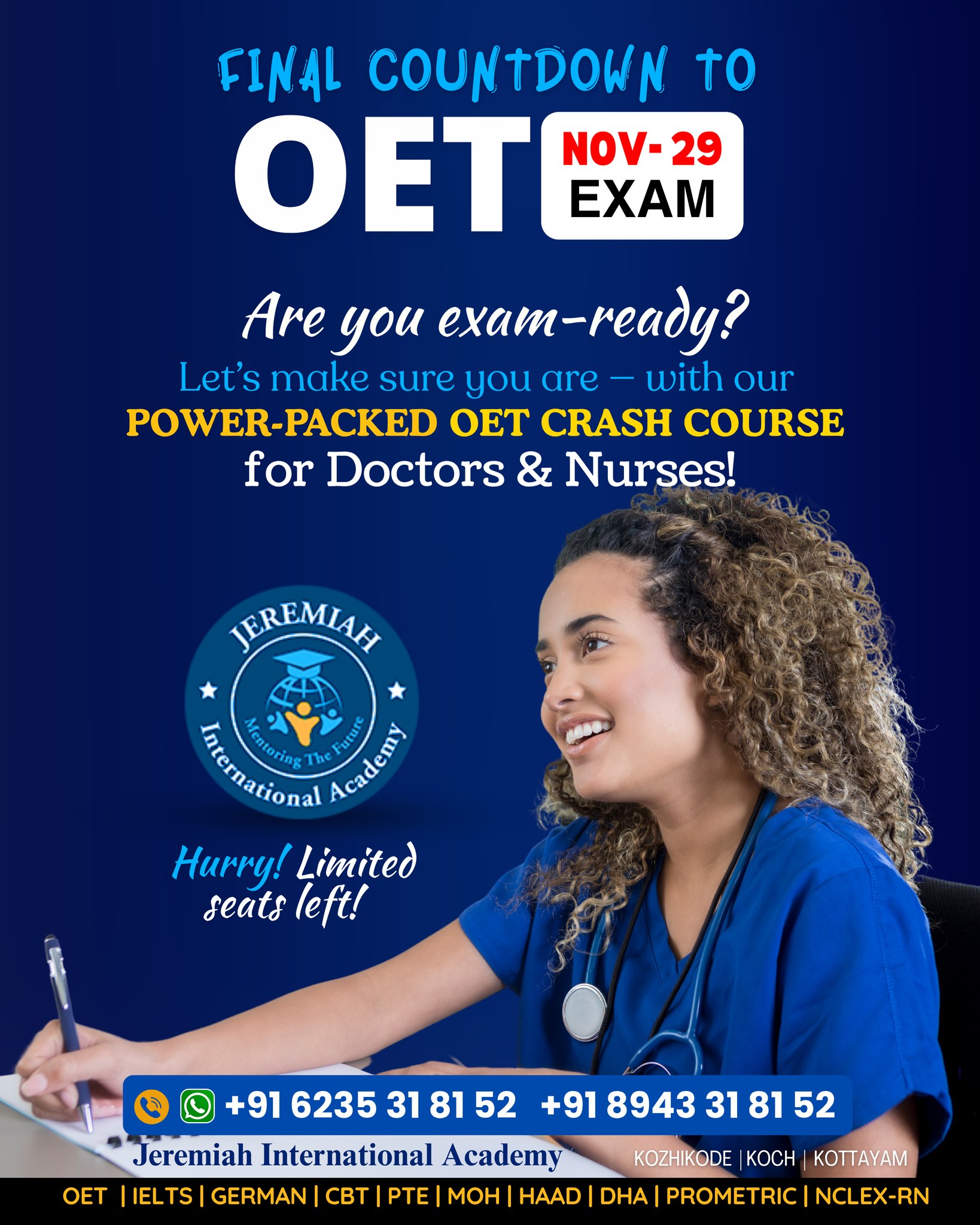 Jeremiah International Academy (JIA) is a dedicated training institute based in Kozhikode (Calicut), Kerala, with additional branches in Kottayam and Kochi. They specialize in coaching for language skills, professional development, and licensing exams, primarily aimed at individuals looking to study or work abroad. JIA offers preparation for key international language tests like IELTS and OET, along with other professional and licensing exams such as PTE, CBT, and NCLEX RN. They also provide foreign language courses in German and French for various proficiency levels. The academy features a range of learning options, including online classes, traditional in-person sessions, and short-term crash courses. They also help with exam registrations and offer support for distance learning. In addition, JIA provides recruitment and placement services for professionals, especially in the healthcare sector, who are seeking opportunities overseas.