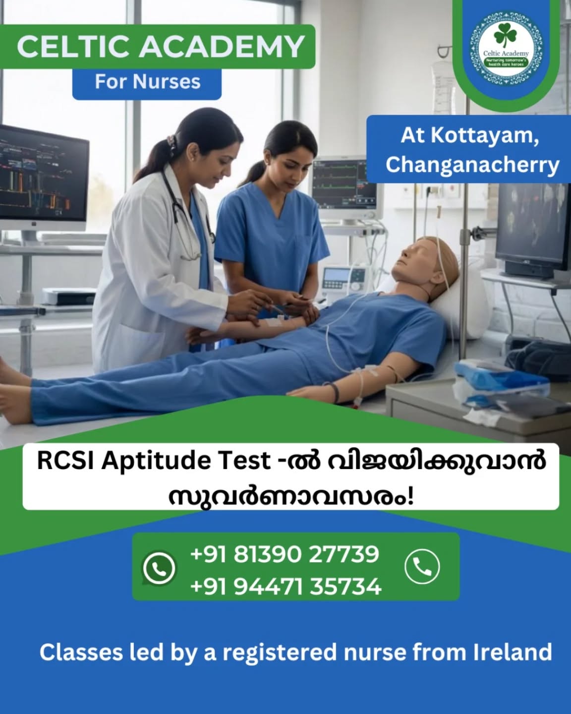 The Celtic Academy for Nurses, founded in 2024 in Changancherry, Kottayam, is led by Siny George, an Irish registered nurse since 2003. Our academy focuses on preparing nurses for the Irish aptitude tests. With her vast clinical experience, Siny has successfully guided many aspiring candidates through the APTITUDE TEST IRELAND and OET, helping them achieve their goals. Conveniently located in the heart of Changanacherry, our academy is easily accessible. We also offer hostel facilities, including meals, to support our students.